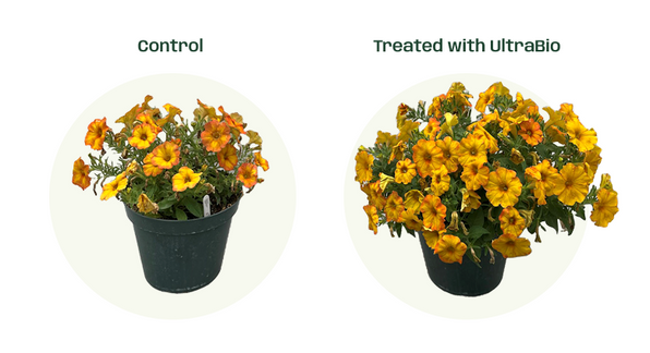 Disclaimer: The images depict plants under different conditions, with the plant on the right treated with "UltraBio" and the plant on the left serving as a control. While efforts were made to maintain consistent conditions (e.g., same water, lighting, etc.), individual results may vary. Results are not guaranteed, and the appearance of the plants may differ in other environments or with different application methods. This depiction is for illustrative purposes only.